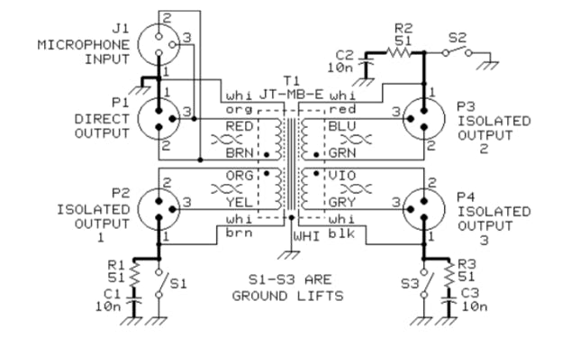 The Jensen JT-MB-E schematic (see the DIY section below) shows individual ground lift switches for each of the three outputs and each output has its own RF filter network. The braided shields in all mic cables can act as antennas and pick up nearby radio energy—cellphones, two-way, WIFI, stage walkie-talkies, wireless microphones, etc. This energy will impose itself on the microphone signal and generate noise in the audio signal. Even with the ground lifted, these RF filters always terminate6 the connected mic cables’ shields to ground above 300-kHz and eliminate radio frequency interference without affecting the audio signals.