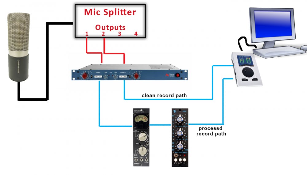 Splitting a microphone signal is a delicate process. Microphone signals are extremely low-level signals that must be treated carefully or the signal will become distorted, noisy, or otherwise colored. Don’t be tempted to simply use a “Y” cable to send the output of a microphone to more than one mic preamp. This wiring can cause phantom power problems as well as strange microphone behavior due to loading the microphone with too low an input impedance.