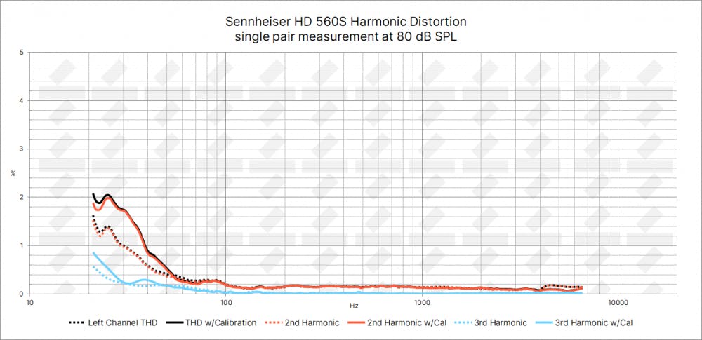 In their marketing materials, Sennheiser boasts about their distortion-free bass that remains clean even at high volumes. Our measurements corroborate that claim, at least to some extent. At 80dB SPL, which can be considered a moderately high volume, the harmonic distortion is low for open-back dynamic driver headphones and will lead to no audible artefacts, also when calibration is applied. But to be honest we would expect nothing less from recently released headphones.
