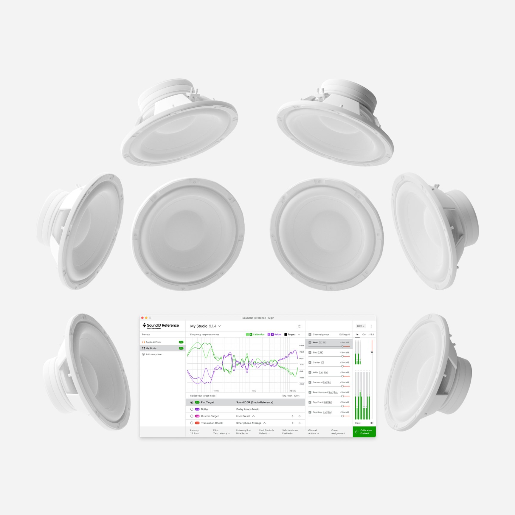 Choose your calibration Profile and correct for the Dolby Atmos Music curve, flat frequency response or create custom profiles.