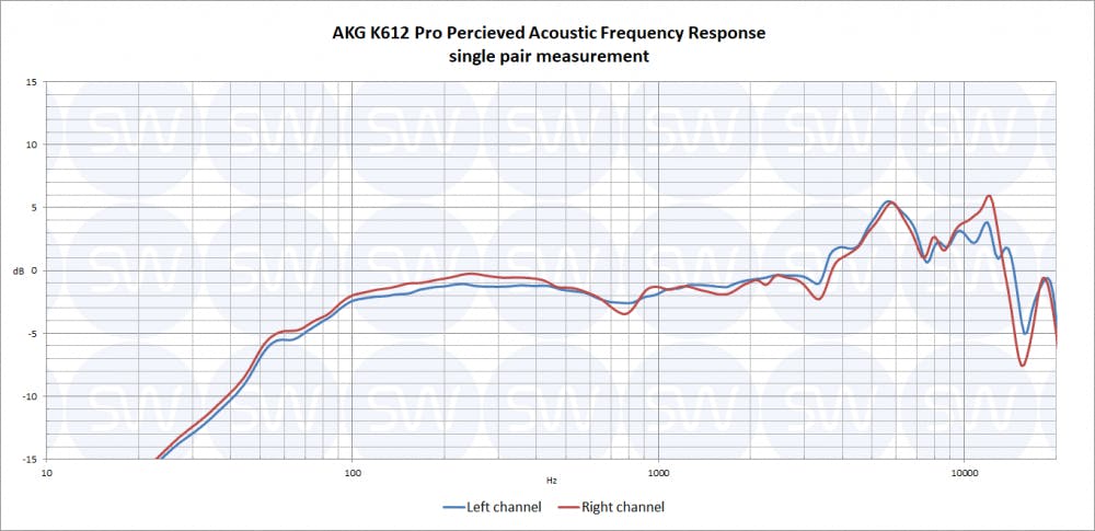 Now to the best part – there aren’t many headphones out there that can compete in flatness with the K612 Pro. The 100 Hz to 3 kHz stays within 2dB, and the increase in higher frequencies reaches only a relatively moderate 5dB, beating one of its main rivals Beyerdynamic DT 880 Pro. The mid-range will sound very natural with only negligible coloring and the high end boost will not translate to overly harsh sound.