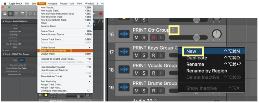 Here is the shortcut to creating new Print Tracks for updates or alternate mixes. The Logic Pro X Track Alternatives feature is the perfect tool for this. Track Alternatives are like playlists; audio tracks containing multiple alternate sets of regions, while sharing the same Channel Strip and plug-ins. For instance, one track alternative might contain the Main Mix, while another alternative on the same track contains an instrumental mix. One, and only one, Track Alternative is active when you play back or record onto that track. The Track Alternative menu is used to choose which Alternative is active versus inactive for a given track.