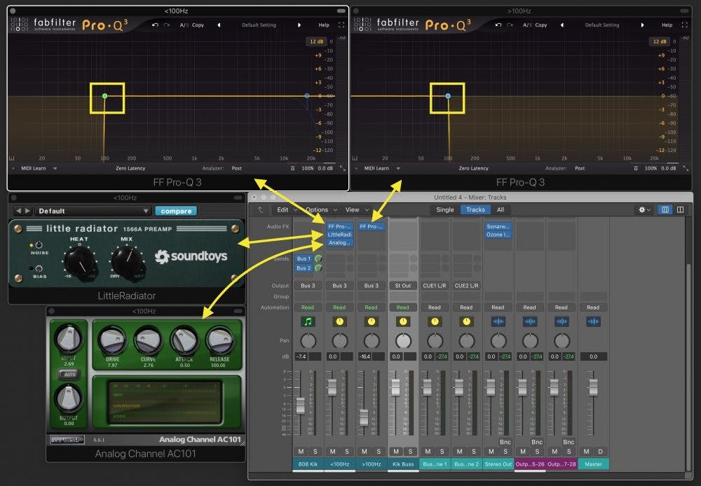 Here we see a Logic setup with 2 Fabfilter EQs splitting an 808 boom into high and low channels. Soundtoys’ Little Radiator and McDSP’s Analog Channel plugins provide harmonic distortion and saturation to enhance the high-frequency portion of the 808, while the sub portion remains clean.