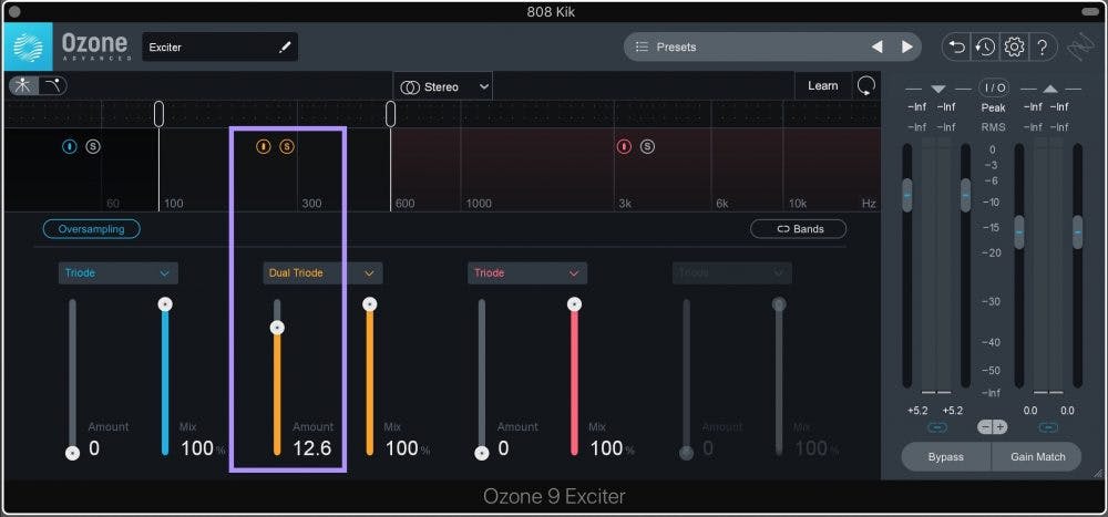 Ozone 9 multiband Exciter, set to process only the 100Hz – 600Hz range. Note the high and low bands’ Amount sliders are set to 0.