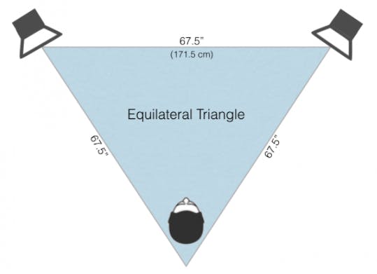 Where and how you place your speakers (and listening positions) in your studio determines how well you achieve an accurate frequency response and a solid stereo image. Ideally, your listening position and the two monitors form an equilateral triangle. In other words, the distance between the left and right speakers and the distance from each speaker to the back of your head should be equal. A tape measure, a piece of string, or even a guitar cable will help you set up this triangle. There are some recommended starting measurements for the triangle, but it is most important that each side is the same length.