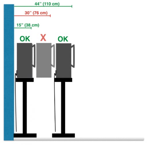 If your speakers have a rear port, just keep the speakers away from the wall at least the same distance as the diameter of the port, usually about 5 to 10 centimeters. Speakers placed with their front surface more than 15 inches (38 cm) and less than 44 inches (110 cm) from the front wall run the risk of creating uneven bass response due to low-frequency reflections from the front wall. Similarly, try to place your speakers at least 44 inches from their nearest side wall. If your speakers must be placed near a side wall or a corner, try the quarter-space EQ setting on the speaker to mitigate any extra bass build-up. You will, of course, need some acoustic treatment on the front and side walls, so leave at least a few inches for that. For a more thorough look at speakers/wall interactions, check out the links at the end of this article.