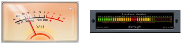 The VU meter is the most common meter and it represents the average short-term loudness of a signal. They were designed to emulate the way the human ear perceives the energy or loudness of an audio signal during recording and mixing. VU meters have a moderately slow response time (300ms rise and fall), so they don’t show transients or peak levels, limiting their applications. Digital VU meters are often simply called RMS meters. VU meters are handy for monitoring the level of a mic preamp or analog signal processor, especially on voice.