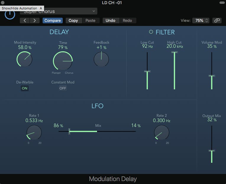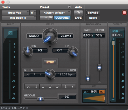 - A double can be created with any delay that provides a modulation section. Modulation causes the pitch and timing of the delayed signal to change slightly over time. Most DAWs’ stock delay plugins should provide the necessary parameters. Here is a formula that I often use with the Pro Tools’ Mod Delay plugin: Copy the word or phrase from the lead vocal to another track. Insert a mono Mod Delay plugin on the new track. Set the delay time to around 20 milliseconds (too long a delay will create an obvious echo). In the modulation section, set the rate (speed) to 0.05Hz, and the depth to around 30%.