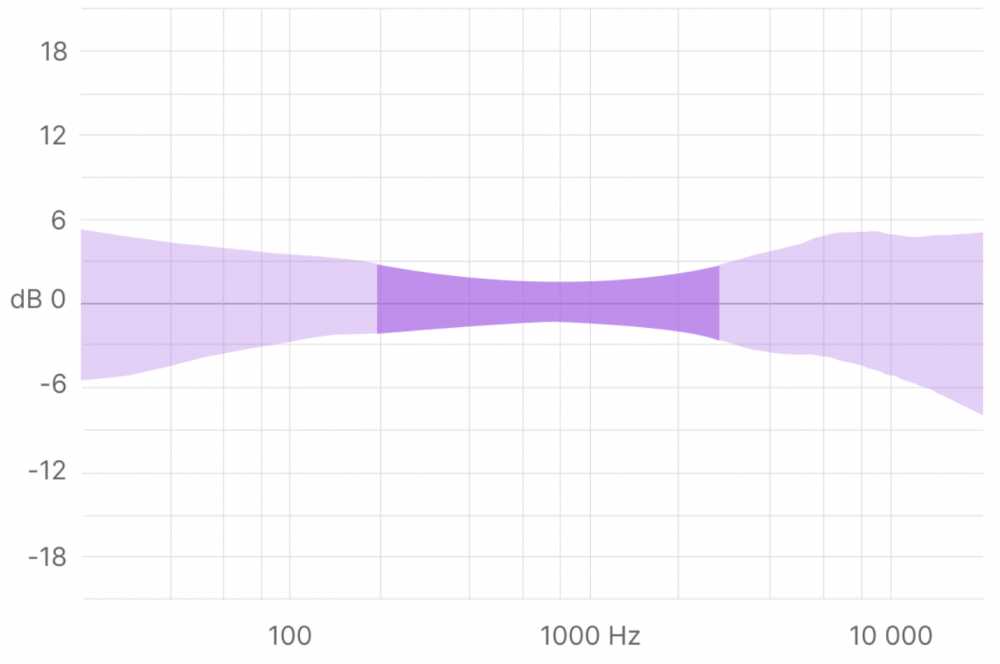 The graph above shows trained listener perceived frequency response deviation for Sonarworks flat frequency response calibrated headphones with a 90% confidence interval. Sonarworks calibration, as validated by the trained human listener panel of 5 people, is +/-3dB in the 200Hz to 2.5kHz range (dark blue) and +/-6 dB in the full audible frequency range (light blue). The increased deviation at low frequencies is due to individual headphone to ear and head fit and high frequencies are more affected by individual ear-specific acoustic properties. This deviation is an inherent characteristic of headphones that stems from the fact that the perceived headphone frequency response is dependent on the listener.