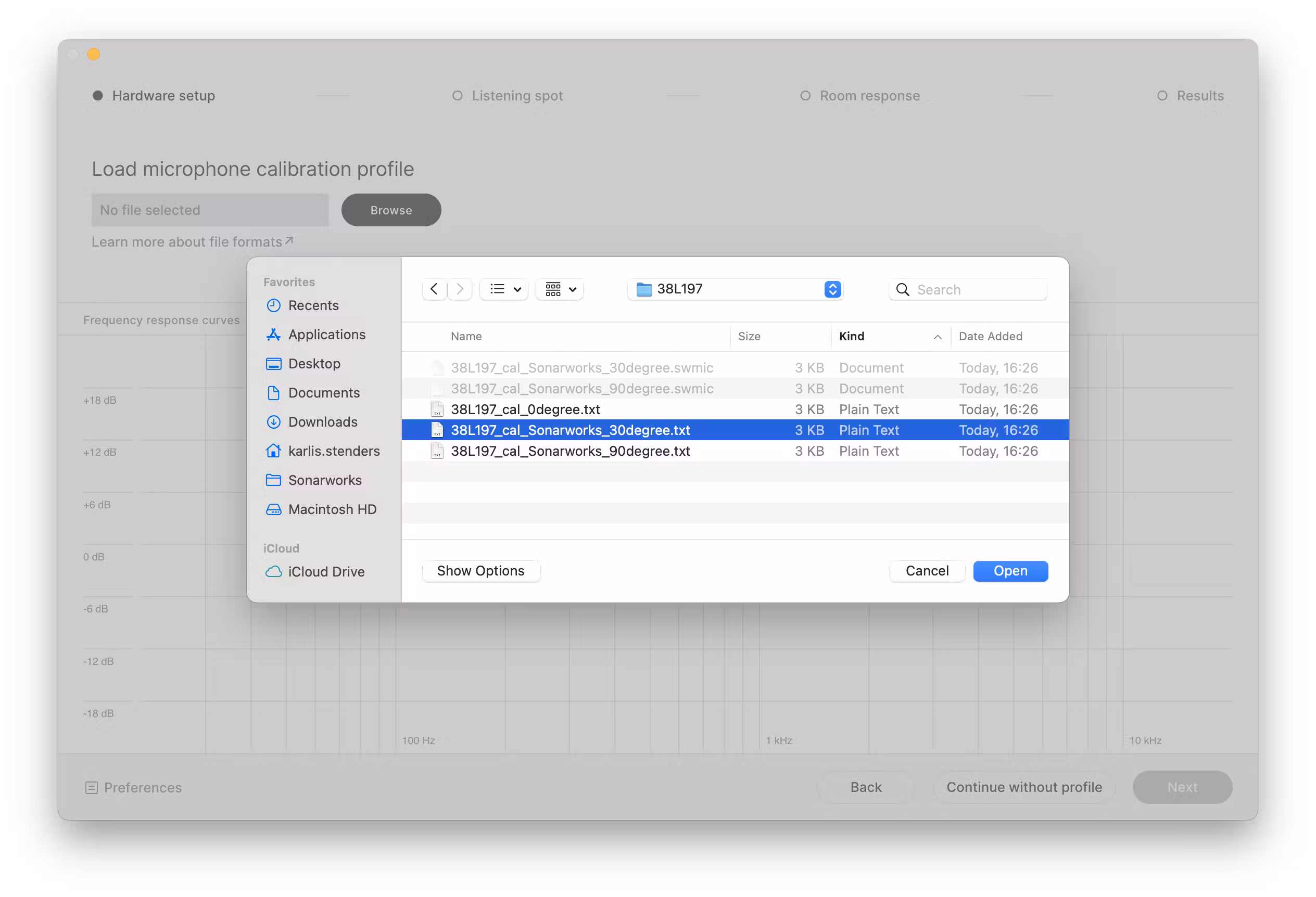 For Sonarworks-native offline use, the Measure app allows for the Microphone Profile to be loaded manually, in case there is no internet access on the computer ("Machine") used for the measurements at the given moment: