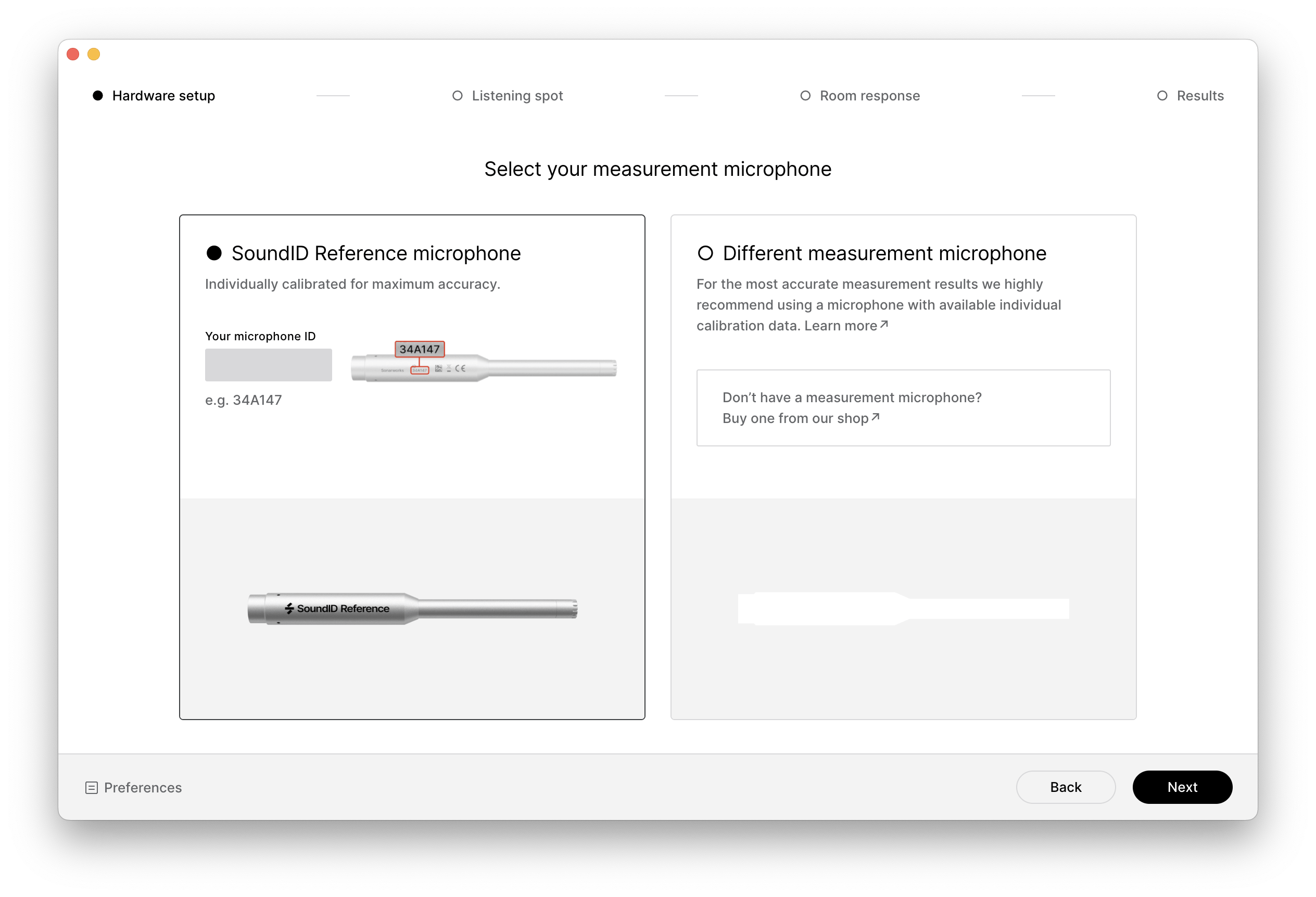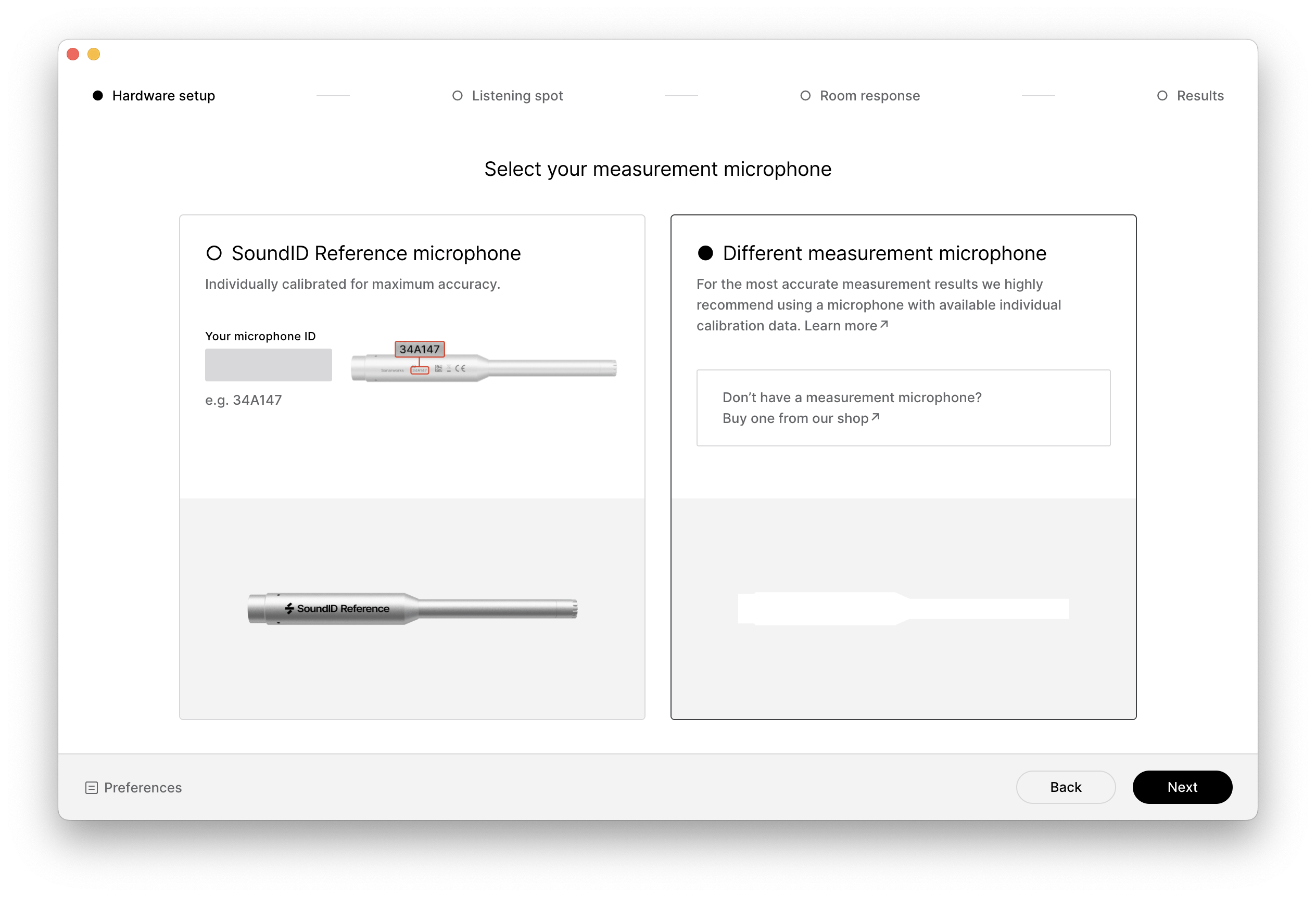 Click on the 'Different measurement microphone' option during the "Hardware Setup" stage in the Measure app, and click 'Next' to proceed.