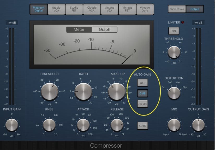 Important Note: Whenever setting up compression, make use of the make-up gain knob on your processor. This control provides a way to maintain a consistent volume when comparing processed to unprocessed signals. It’s very important to occasionally bypass the plugin (after setting the make-up gain correctly) to compare the original sound to the processed sound. This allows you to hear exactly what your settings are doing to the sound. Without the correct makeup gain, you can be fooled into thinking that the louder signal (usually the uncompressed one) sounds better. Plugins that have auto-gain options (such as the free MeldaProductions MCompressor or the Izotope Neutron 3 compressor module) spare you the headache of having to set up the make-up gain yourself.