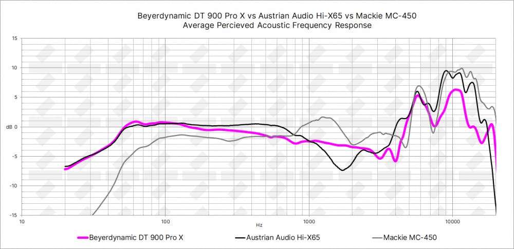 A similar trend continues if we switch out the other Beyer models with the two efficient open-back rivals, the Austrian Audio Hi-X65, and Mackie MC-450. PRO X is the most neutral option with the competition showing heavier coloration in the 1 – 3kHz range and a more significant high-frequency boost.